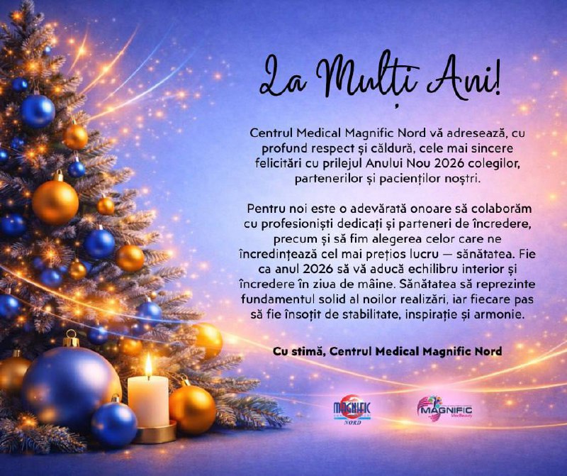 Colegilor, partenerilor și pacienților noștri, Centrul Medical Magnific Nord vă adresează, cu profund respect și aleasă considerație, cele mai sincere felicitări cu prilejul Anului Nou 2026.